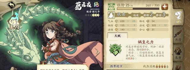 英灵定位:葛云衣的天赋效果可以提升治疗效果,同时对友方释放绝学后施加行动后回复气血状态,治疗能力十分优秀。葛云衣的绝学主要以群体治疗为主,兼顾驱散与增益,特色绝学诸星神曜可以施加物理、法术免伤效果,在面对强力范围绝学时合理使用可以极大地保证团队的生存。