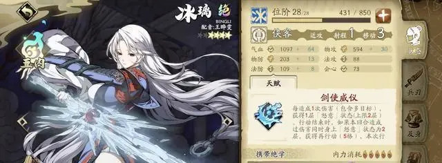 英灵定位:冰璃作为侠客可发挥的功能很多,除了灵活移动外,还可以承担一部分伤害,在没有合适的铁卫的情况下可以作为铁卫使用。绝学方面可以起到先攻和降低敌人攻击、影响敌方移动力等攻守作用。