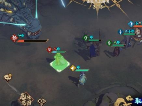 封铃笙给夏侯仪加血,璇玑走到这个位置用雷引打鬼卒传到冰璃或者古伦德身边,冰璃去砍红色小怪,古伦德待机