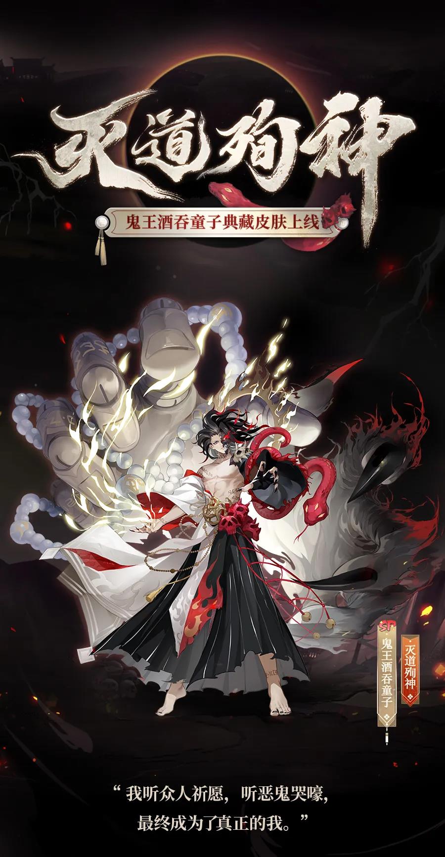 鬼王酒吞童子典藏皮肤·灭道殉神将于6月16日维护后上架皮肤商店,售价148魂玉,上架首周可享端午限时折扣98魂玉。