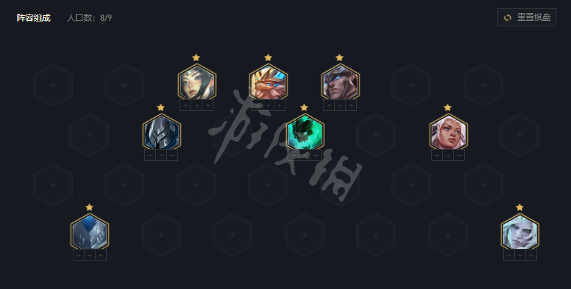 7人口搜一张武器,其他大部分骑士和神盾有个2星即可锁血上8,先用奥拉夫代替佛爷因为有3哨兵效果。