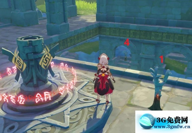 在水池的另一端可以找到1个挑战和被锁住的3号仙灵。挑战为1分钟内击杀4只水属性大史莱姆,香菱或者丽莎开大招轻松解决。