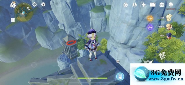 2、湖水退去后的湖中央有1个华丽的宝箱和1个岩神瞳,但是他们被立场所包裹(不是简单的风场,无法通过高处滑翔飞进去)需要旅行者找到3只仙灵以解除立场。