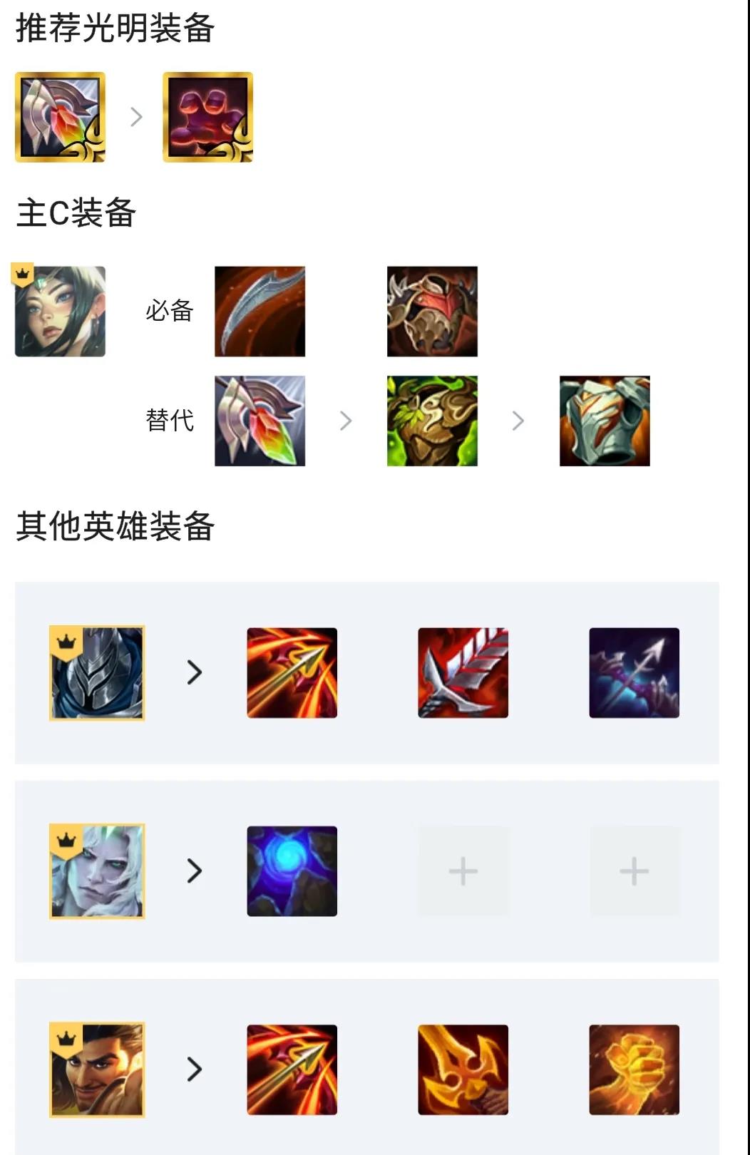 毕竟刀妹只能算一个肉C,核心输出位置还是以武器为主,武器的装备根据阵容来决定,如果对面像是铁甲阵容比较多的情况下,可以考虑做破甲弓。其他装备带一个恢复能力的即可,最后一件根据阵容来选择。