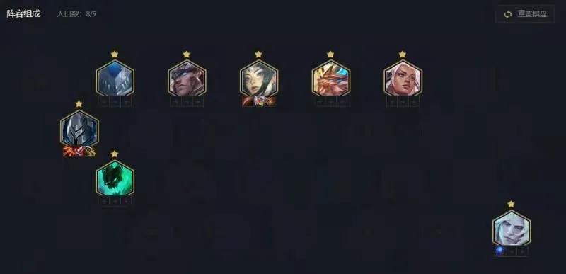 9人口补充一个阿克尚凑出最终阵容。阿克尚是补充阵容伤害的最后一环,因为在8人口我们已经阵容成型了,无须再害怕任何输出,只是输出有点缺乏,只能靠肉来扛。
