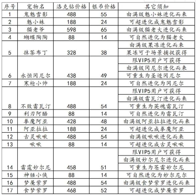 每种宠物只能选择其中一种形式(指银币或洛克钻)获得/进化一次。