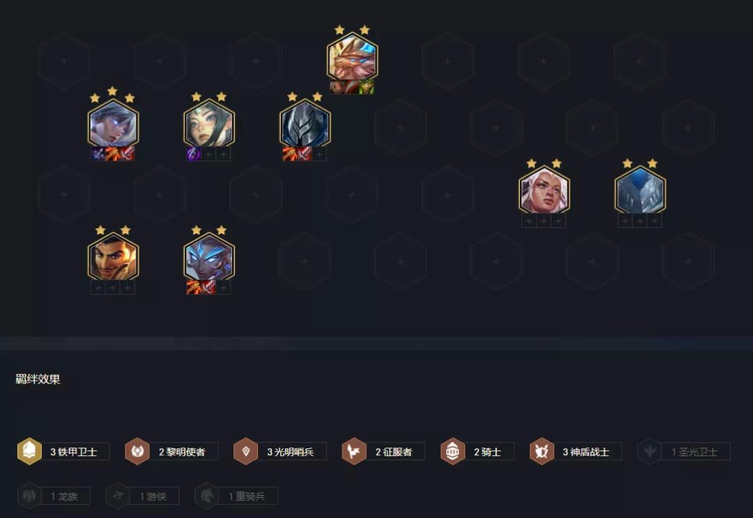 阵容棋子方面开始考虑转型,像铁甲神盾骑士靠拢。阵容最优泰坦+任意骑士(加里奥最优,别的骑士携带坦度装备)+3神盾(刀妹+豹女+任意神盾)+锐雯+芮尔/武器(没有就上高坦棋子如猪妹)。