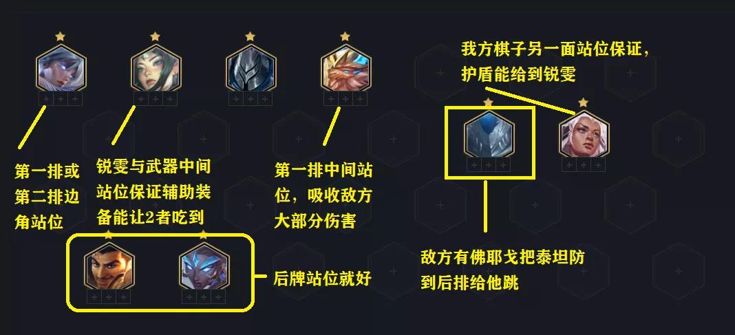 锐雯3星后基本无天敌,强度非常高站位更是可直接顶到第一排开局吸收伤害,释放技能控制敌方棋子,直接收割。