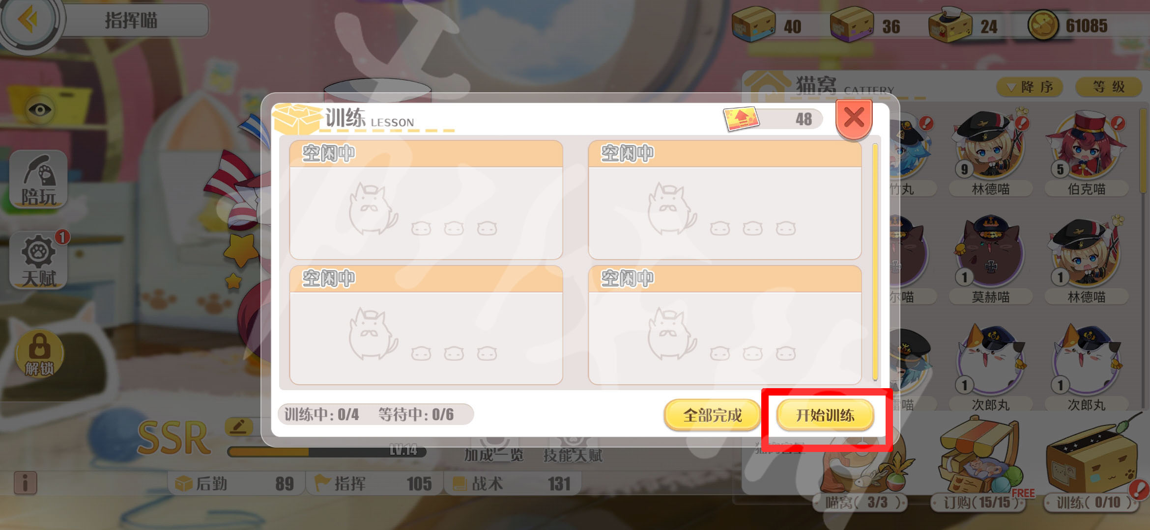 进入训练界面,点击开始训练,选择需要训练的喵箱。