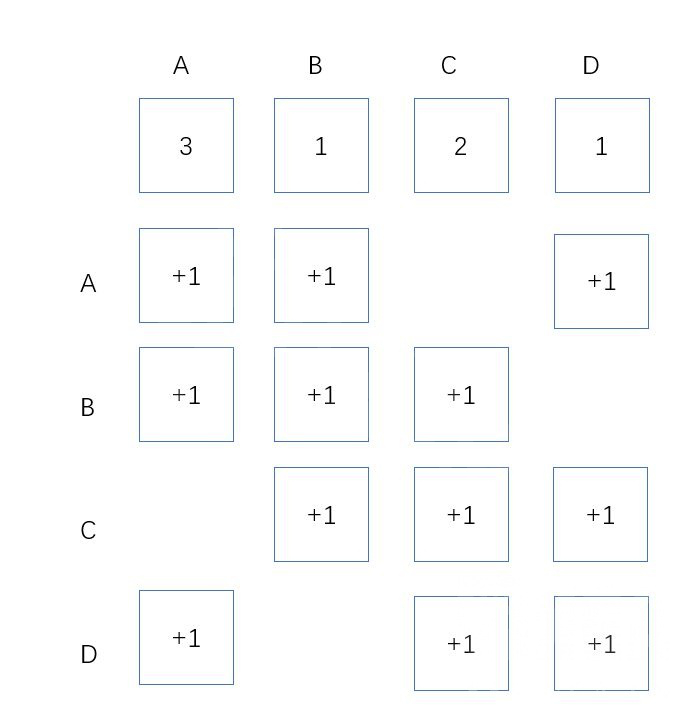 第一行的ABCD为盒子标号,第二行的数字为初始状态,左边第一列ABCD对应的是击打标号盒子会产生的变化。