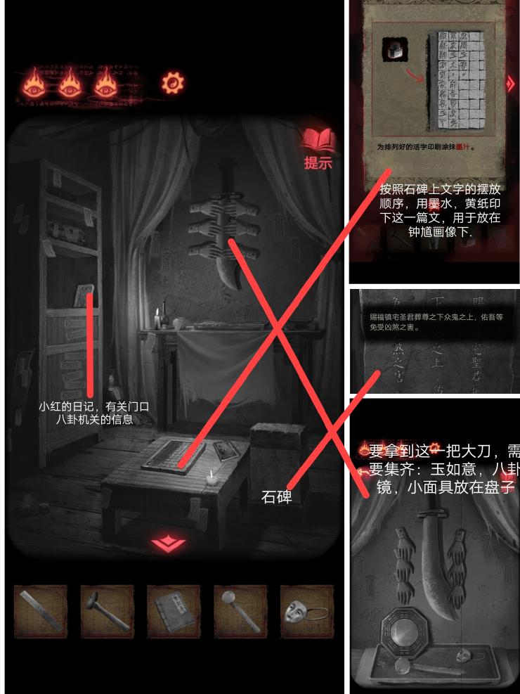 7、这个时候拿到墙上那一柄大刀后,这个地方就会坍塌.拿着刀砍掉戏台上的木偶,便会得到一个奇怪的符号,这个时候退回到门口.梁少平说关门的机关在童子的眼睛上,关门后按照这个顺序点击按钮;