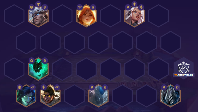 德玛西亚之力—盖伦(5)、正义巨像—加里奥(4)、钢铁少女—芮尔(4)、魂锁典狱长—锤石(2)、寒冰射手—艾希(3)、暗夜猎手—VN(1)、深海泰坦—诺提勒斯(2)、曙光女神—蕾欧娜(1)2.羁绊