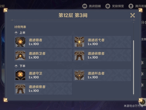 很多小伙伴都说12-1是最难的,这里就稍微说一下吧,12-1的难点有2个 一个是怪太能跑了,然后就是会回血, 这一点最好解决的就是永冻流,然后就是高爆发直接碾压过去, 如果时间不够的话,下半场记得带温迪这种聚怪的角色除了镜女其他愚人众很容易聚起来,简单点说就是上层控制下层聚怪。