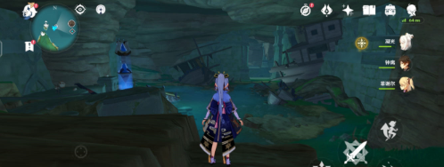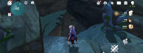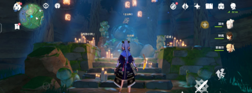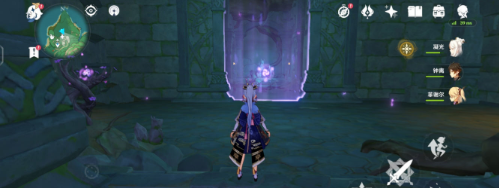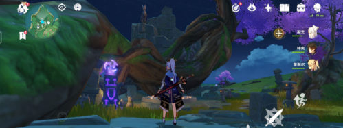 第四个【荒海】这里找那个雷元素柱子全部点亮,然后会给一个宝箱,然后跳就那个残缺圆洞里里面有一个紫色石狐用留念镜识别然后按墙是的突出石板