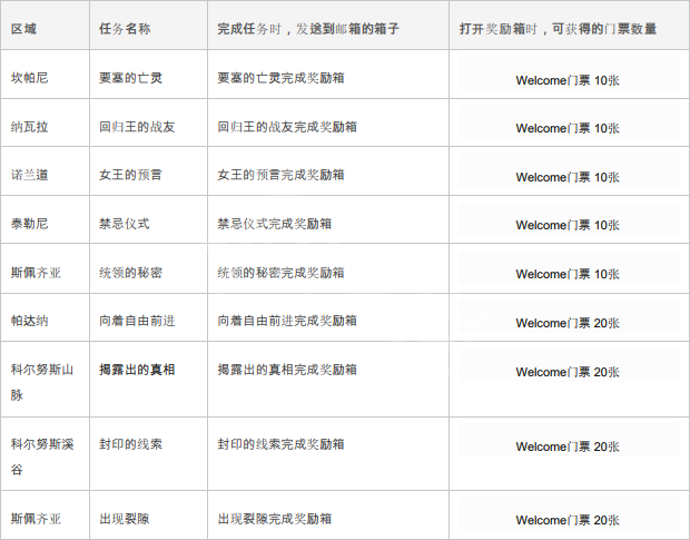 每次完成以下主线任务时,Welcome门票会发送到在游戏内的邮箱。