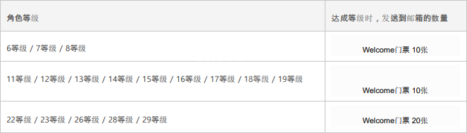每次达成以下等级时, Welcome门票会发送到在游戏内的邮箱。