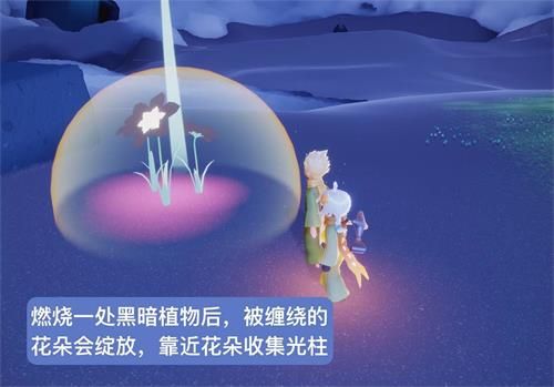 4、燃烧一处黑暗植物后,被缠绕的花朵会绽放,靠近花朵收集光柱