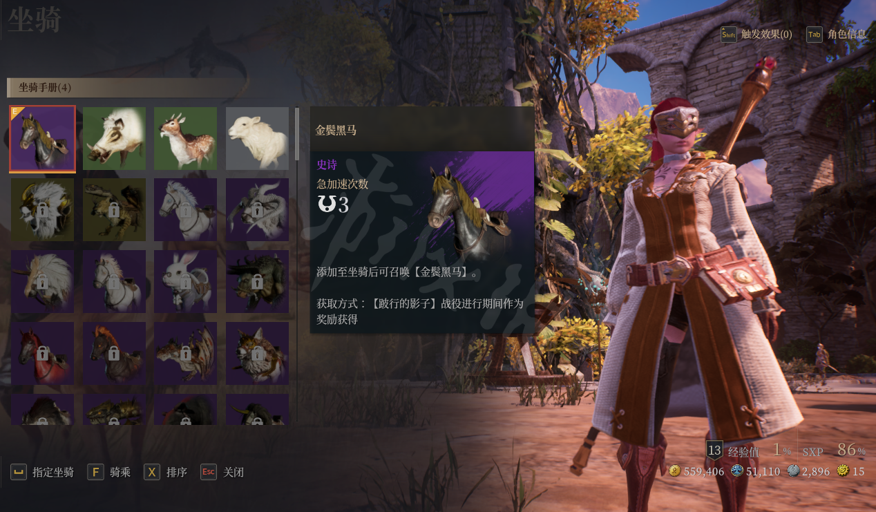 1. 进入菜单>坐骑,检查登记的坐骑。