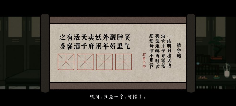 古镜记游戏的酒楼中有一个猜字谜游戏,谜题是一句诗,谜底为4个字。