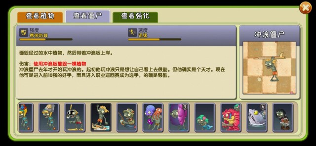 冲浪僵尸,冲浪僵尸在冲浪期间无视海上植物,落地后举起冲浪板,可以抵挡投掷伤害,遇到第一个非低矮植物后插下冲浪板形成随碍物(冲浪板的阶数跟随着冲浪僵尸的阶数而变化),冲浪僵尸在陆地上死后,若冲浪板仍在它的手中,那么冲浪板也会掉落形成一个障碍物。如果冲浪僵尸左右有植物,板子会优先落在有植物的地方。5阶大嘴的大嘴倾盆可以吞掉冲浪板。注:2阶荚兰的空气 炮不能击飞,只是击退而已。