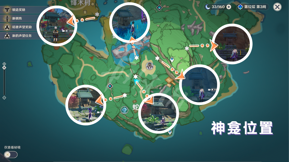 在八酝岛中一共有6处神龛,具体位置如下图。