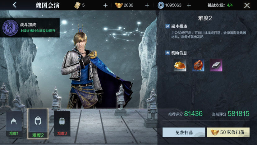 需要注意,不同难度的会演是需要主公达到一定等级后,获得军师的认可方能挑战的。并且各国的会演需要对应国家的武将方可出战挑战,譬如蜀国的会演只能由赵云等蜀国武将参加,吕布是无法被编入挑战队伍的。