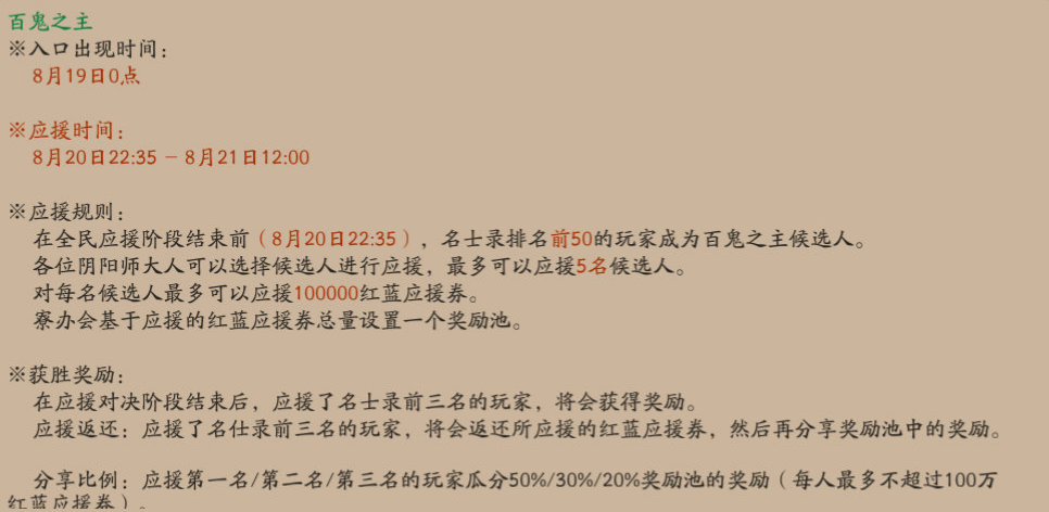 应援规则:在全民应援阶段结束前(8月20日22:35),名士录排名前50的玩家成为百鬼之主候选人。
