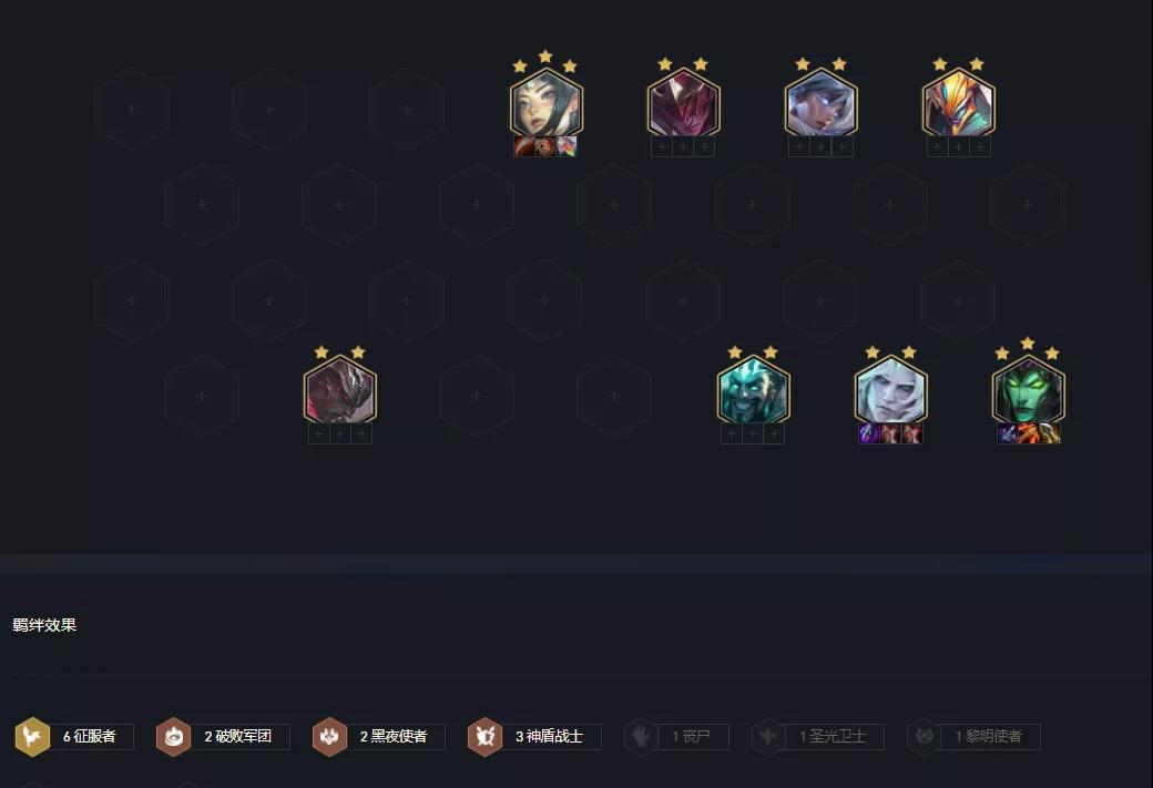 这套阵容也是在搜卡时候剑魔不能三星,可考虑转的阵容。阵容需要刀妹2星早否则不能锁血,慢慢添加6征服,7-8人口挂铁甲或3神盾或2复生,滑板鞋在6征服下特别变态,将近1秒2刀,技能与普攻伤害均极其强势,刀妹在征服羁绊下开启技能后减伤更高,坦度更位优质。