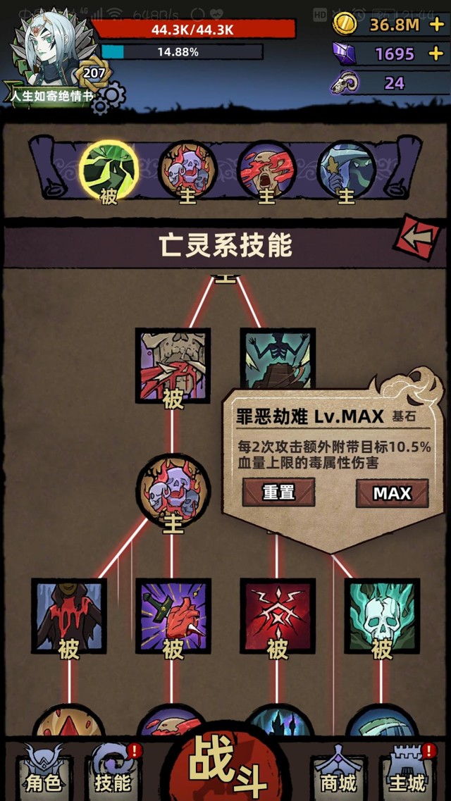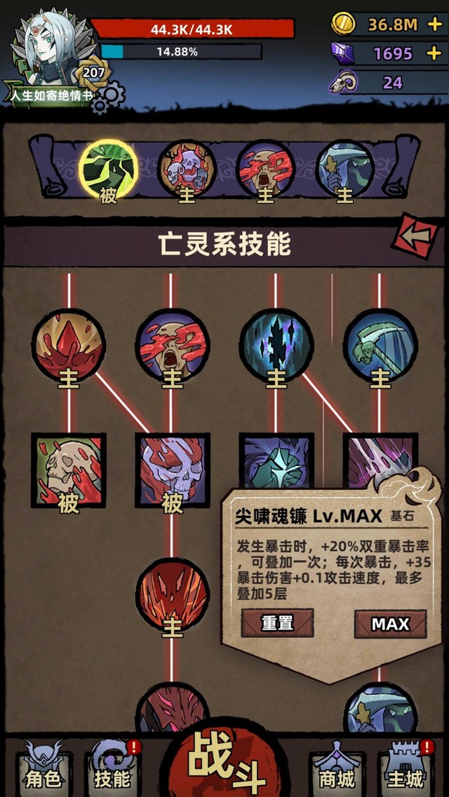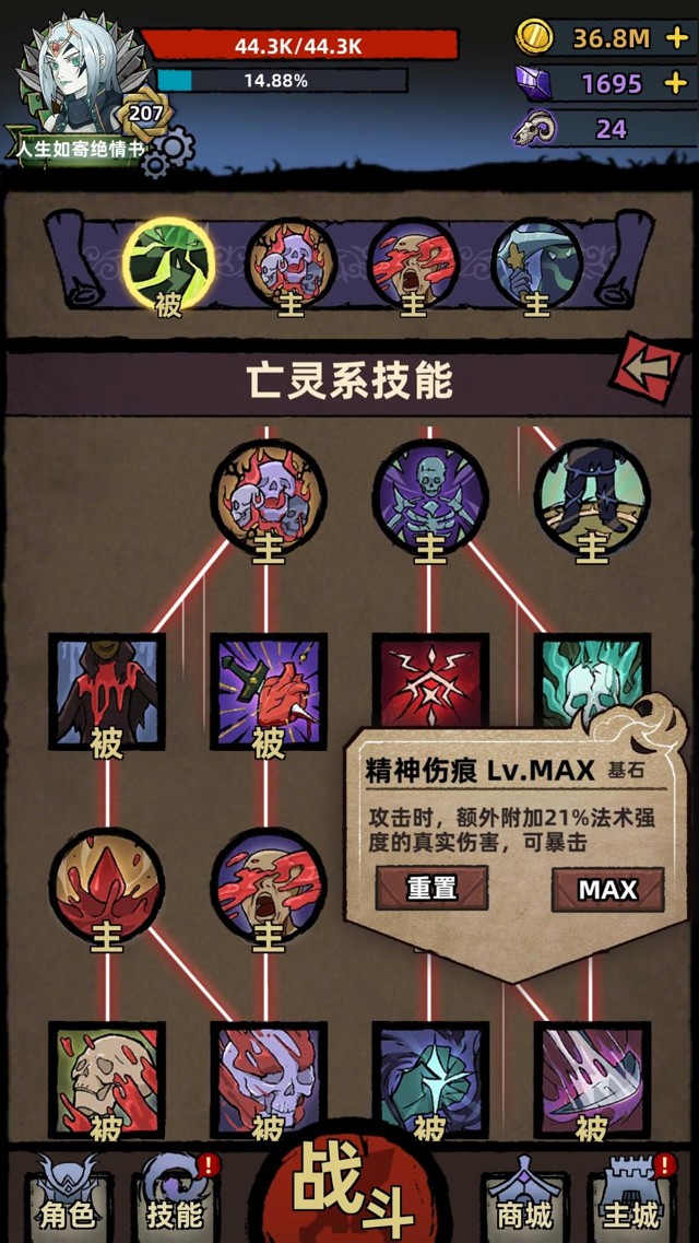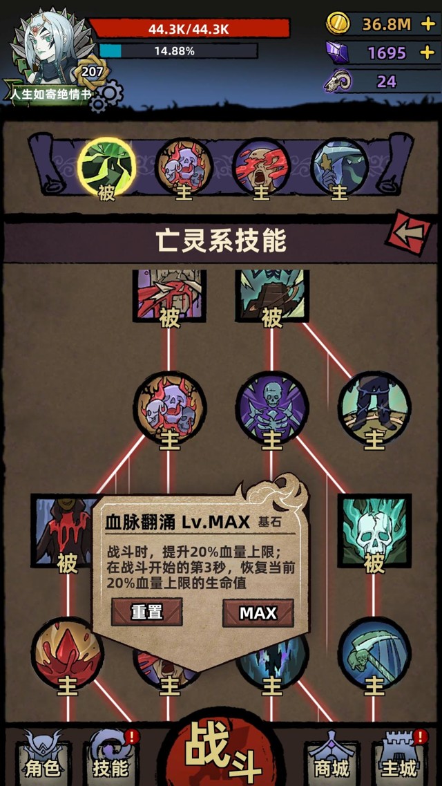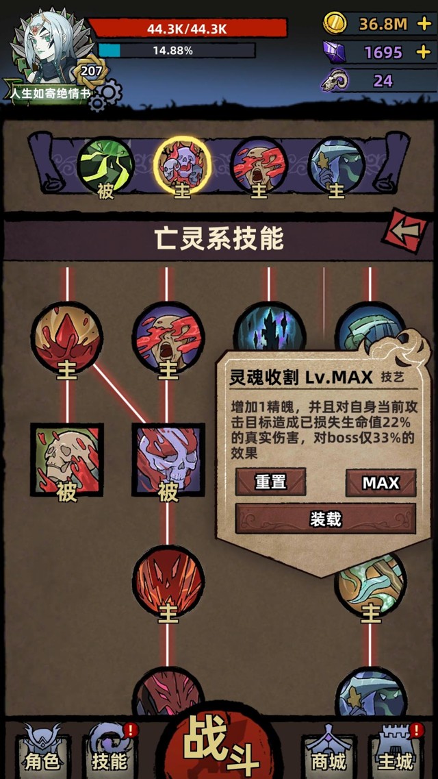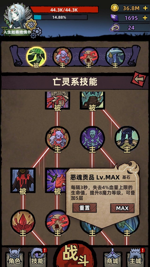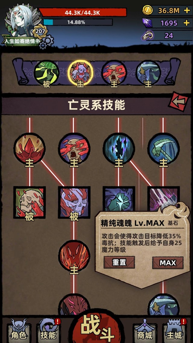 ⭐️技能模式是技能树模式,技能树左边是血肉系技能【提升输出、提升坚韧的buff类技能】,右边是灵魂和毒素技能【输出技能、提升输出的buff类技能】