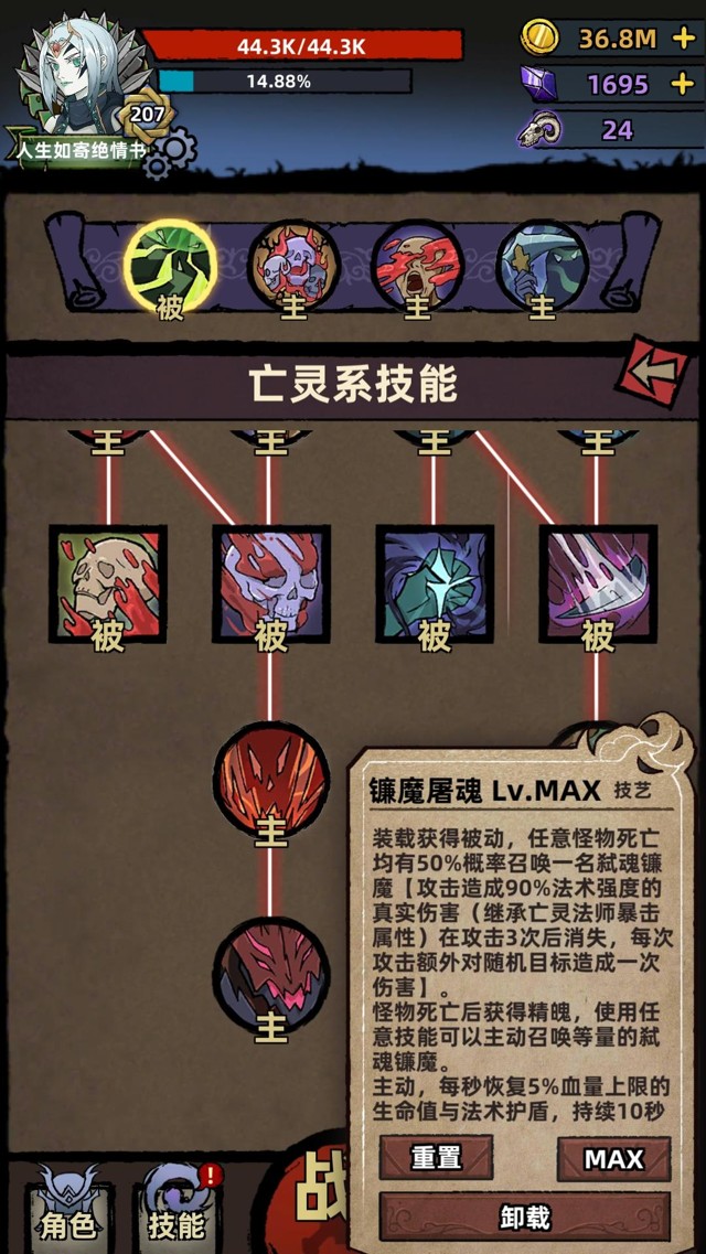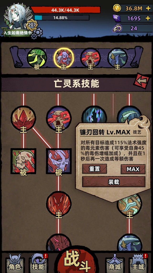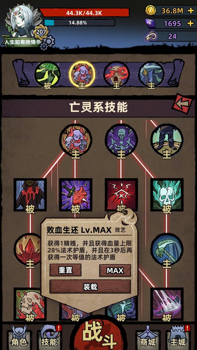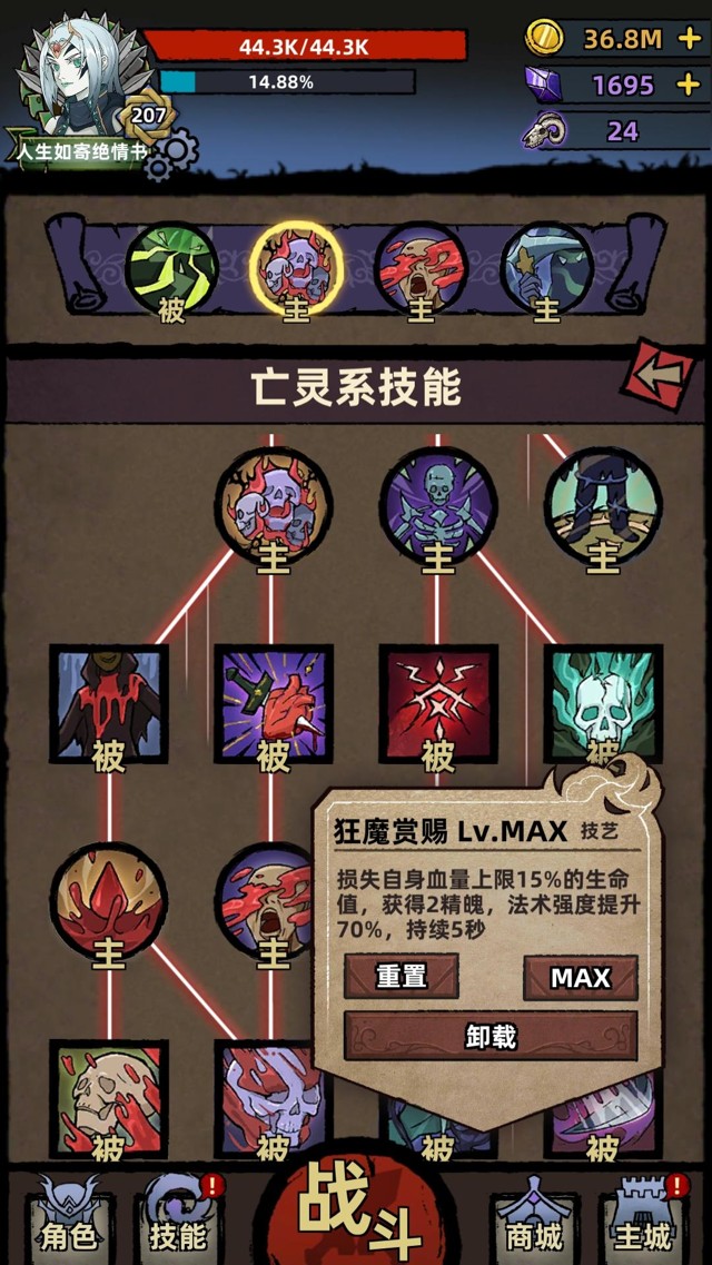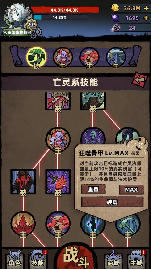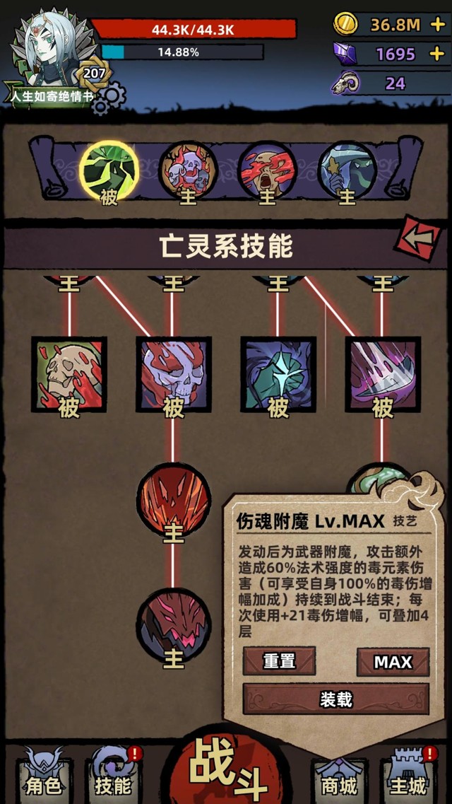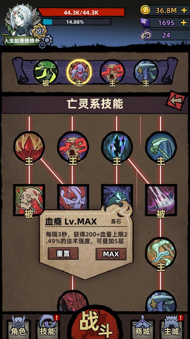 ⭐️技能模式是技能树模式,技能树左边是血肉系技能【提升输出、提升坚韧的buff类技能】,右边是灵魂和毒素技能【输出技能、提升输出的buff类技能】