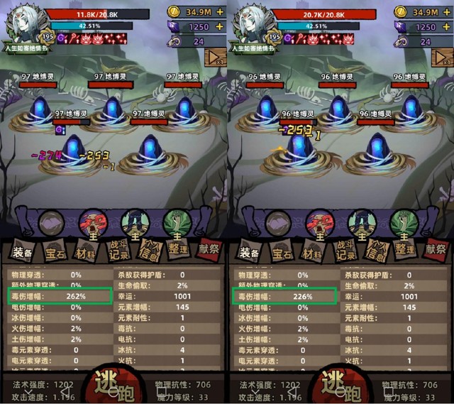 ⭐️根据我的计算,若【沥血元素】计算战斗时血量上限,则总毒伤增幅应为262%;若【沥血元素】仅计算站街时的血量上限,则总毒伤增幅应为226%,实际结果与计算结果相同,但又不完全相同: