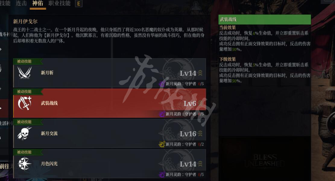 优先加3新月交流,新月交流尽量点到16级,斩击技能可以减反击32秒cd,配合上面反击的加点cd33秒理论情况下可以无缝使用反击-斩击-反击的循环。