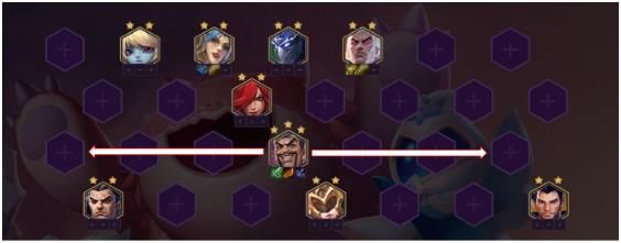 肉顶前,两张卡拉底角防机器人勾,帝国之斧站第三排保证第一时间输出,根据敌方站位可左右灵活调动(注意亚索周围不要站人保证刷出浪人护盾)