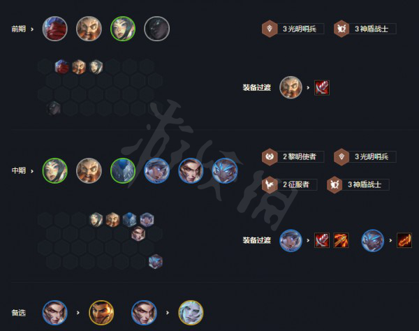 这套阵容比较吃连胜运营。4阶段前,能赢一定要赢,必要时3-2拉6,稍微搜一下质量,两星豹女或锐雯即可锁血上七。4-1上7,再大搜一波,补出三铁甲或者三光明,就可以卡着50利息,慢慢追三星。