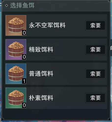 总共有四种不同的饵料可供少侠们获取哦!不同的饵料可以捕获不同的鱼类,少侠们可以通过图鉴查看不同鱼类的捕获条件。