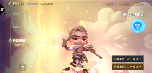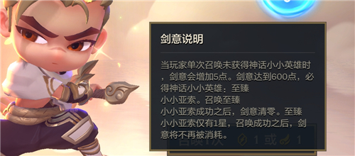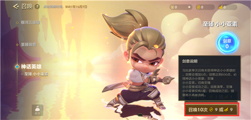 在神话英雄召唤界面,至臻小小亚索运气不好则是需要玩家将【剑意注满】才可以必出,经过计算保底价格在648RMB。