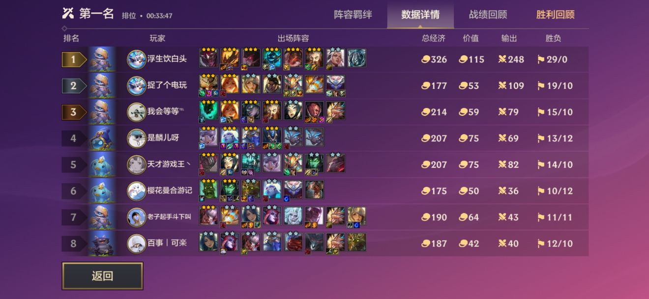 小编这里摸索着玩了这套阵容第一局,而且小编也是新手,就轻松满血第一,强度当然是有的,大家不用担心,就连后期的老佛爷,大头,提莫,阿克尚都有一战之力!