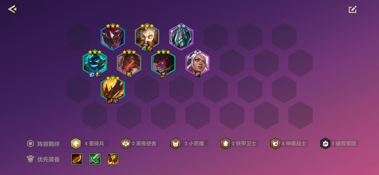 这套阵容精妙之处就在这些棋子非常容易升星,前期就可以达到3神盾3重骑2小恶魔2黑夜使者,还可以有三四个三星,羁绊比别人多好多,后期巨肉全是三星,控制也足,护盾数不清,恶心别人快乐自己!