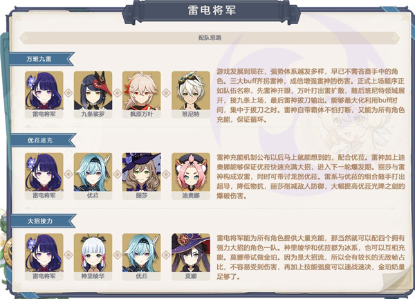如果你的box中有万叶和班尼特,那么加上雷神池up的九条裟罗,可以组成万班九的配队,暂时是理论上雷神主C打法的最强配队。如果你有优菈,那么可以配合雷神的充电能力,让优菈更快转好大招,这是经典的雷神辅助思路。总体而言雷神能出场的地方还是比较多的,与队友配合也比较明显,很值得入手。