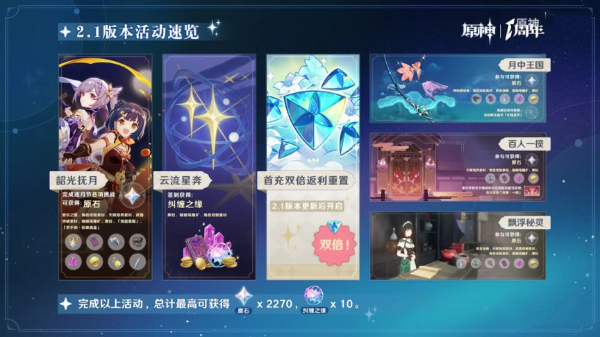 2.1版本的活动并没有展示活动商店等内容,但官方已经整理好通过参与活动能够获得的原石总数。在后续单个角色池原石获取计算中,我们根据不同活动的排期进行了估算。