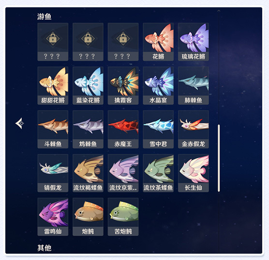 旅行者可以在[图鉴]-「生物志」当中,查看已经钓获的各类游鱼。