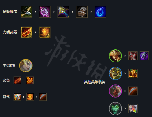 优先天使光明羊刀光明正义最好,其次复活杀人剑巨杀均可,伤害巨高,辛德拉保护装伏击再加个旗子,有鬼书给熊,丧尸带肉装,努努日炎、稻草人龙牙,卡莉斯塔救赎。