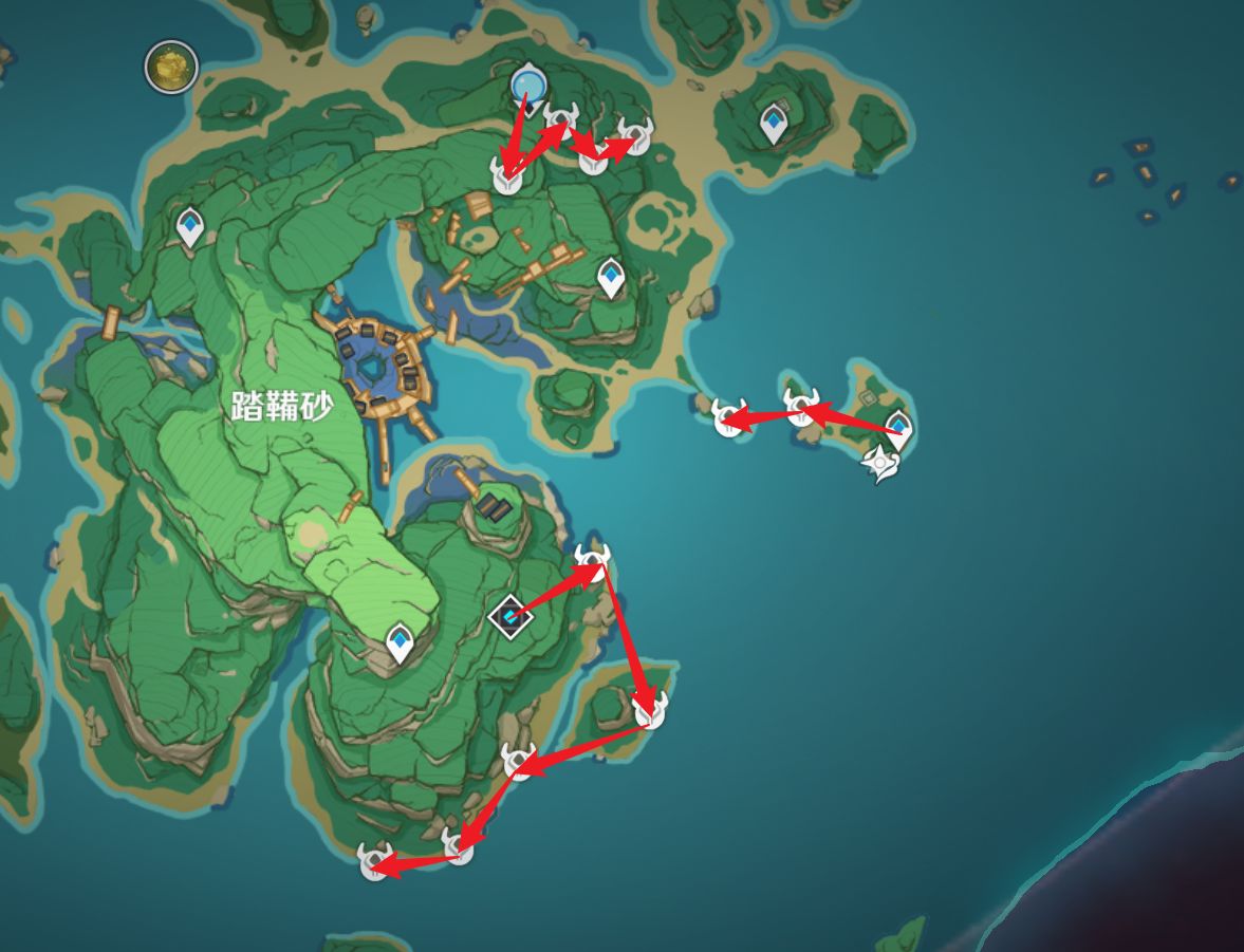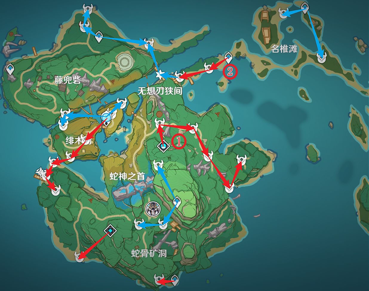 红色线路为高效线路,适合日常刷取。蓝色线路适合急需补充.其中1号线路第三点位、二号线路第二点位均需走到对应位置触发。