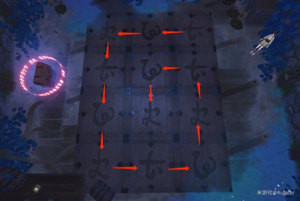 2、跟随藤原俊子来到一处房屋旁,通过启动安装在房屋闸门,按照【宝图】中右下角的顺序依次踩踏房屋周围的3处标有图案的木板:(如图3)