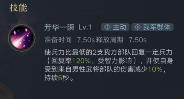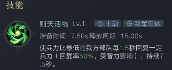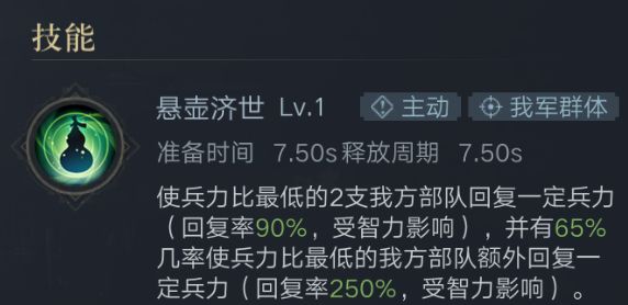 御值2御,使兵力比最低的部队每1.5秒回复一次,持续7.5秒,总计5次。间隔时长15秒。非常优秀的治疗能力,要不是这个长达15秒的间隔时间,这个恢复能力,堪比大乔。紫将的最优治疗将,并且只有2御的御值,性价比超级高,虽然还有一个2御的李典,但现在的李典,只附加吸血能力,没有治疗能力。远不如诸葛瑾。