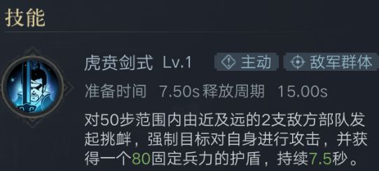 御值3御,对50步(一格36步左右)范围内的2个敌人进行挑衅,并获得80固定兵力护盾,持续7.5秒(1级技能属性)。挑衅,固兵这两个属性,决定了王越在前期的首T属性。虽然随着地块等级难度变化,固兵的作用越来越小。但7级地以前都是很给力的,7级地开始就要准备用吸血武将或输出武将置换了。