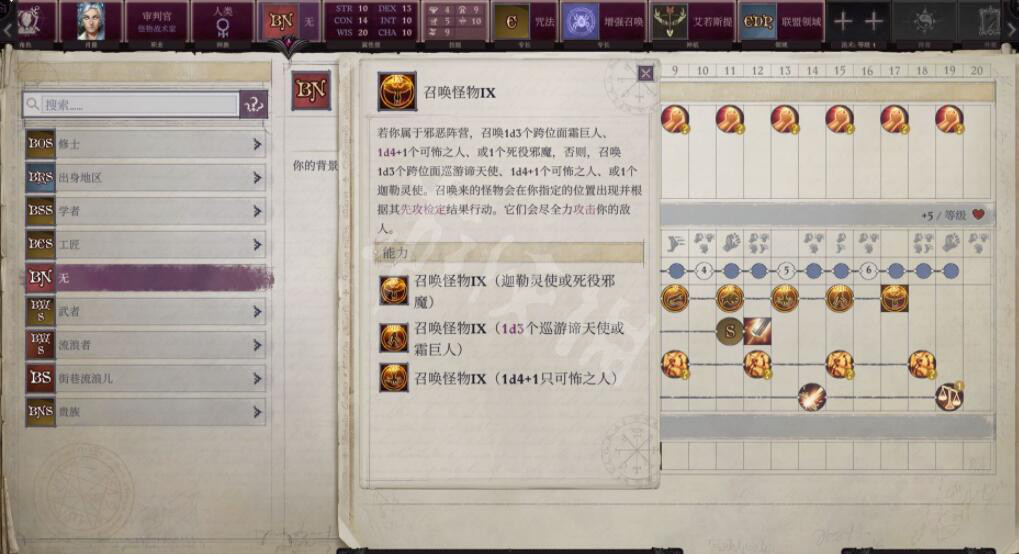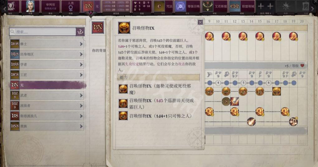 种族选人类,加点就是感知20,敏捷13,其他点数随便加。专长选择专精咒术,然后召唤专精,神抵和自身阵营选个善良的就行。