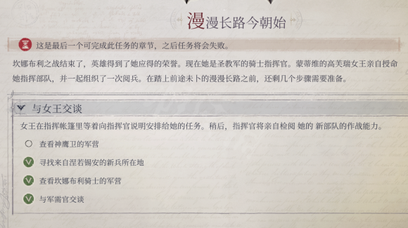问题点在于其他三个查看检阅的任务,玩家去转了之后,不会显示完成,直接去指挥者营长,跟女王对话,就完成了。