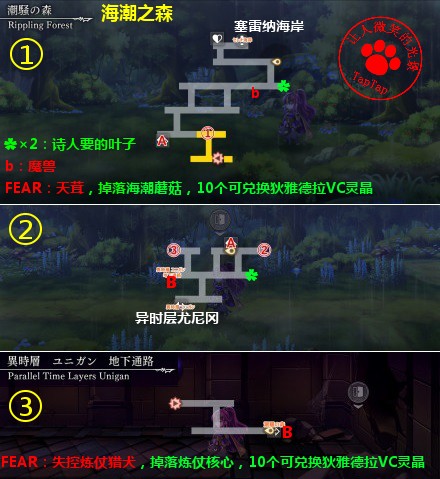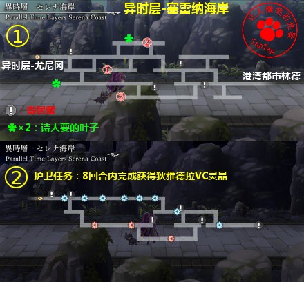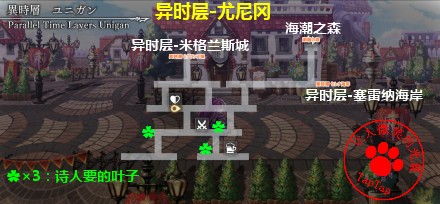 ⑦诗人:白天林德。在异时层找10片叶子给他,其中海潮之森2片,塞雷纳海岸2片,尤尼冈3片,圣骑士村3片,位置见地图