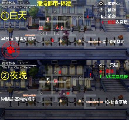 地图:2张,①是白天地图,②是夜晚地图,可在林德旅馆或船-秘密基地旅馆睡觉切换